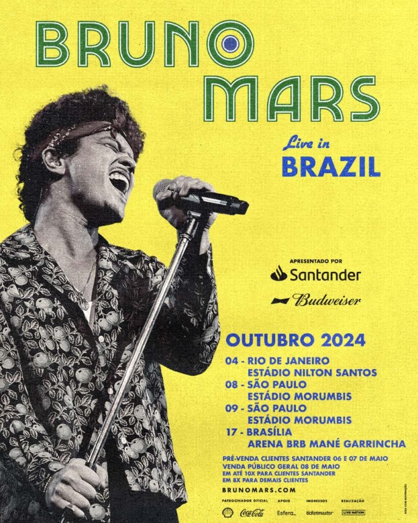 Depois de movimentar o feriado do Dia do Trabalho com faixas em vários pontos do país, Bruno Mars confirma quatro apresentações no Brasil: dia 4 de outubro no Rio de Janeiro, no Estádio Nilton Santos, dias 8 e 9 de outubro em São Paulo, no Estádio MorumBIS, e no dia 17 de outubro em Brasília, na Arena BRB Mané Garrincha. A tão aguardada volta de Bruno Mars ao país deixará os fãs ainda mais em êxtase. Esta será a quarta vez do artista no Brasil após uma passagem icônica em 2023, onde se apresentou duas noites em São Paulo, para um público eufórico de 100 mil pessoas por dia.