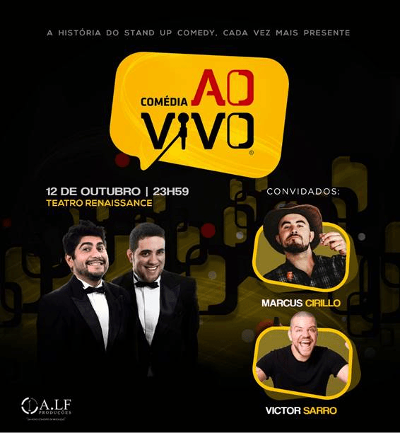 Nesta semana, no Teatro Renaissance, o elenco do Comédia Ao Vivo recebe os convidados especiais Marcus Cirillo e Victor Sarro. Ao lado de Luiz França e Dih Lopez, o quarteto de humoristas promete embalar a noite do feriado, dia 12 de outubro.