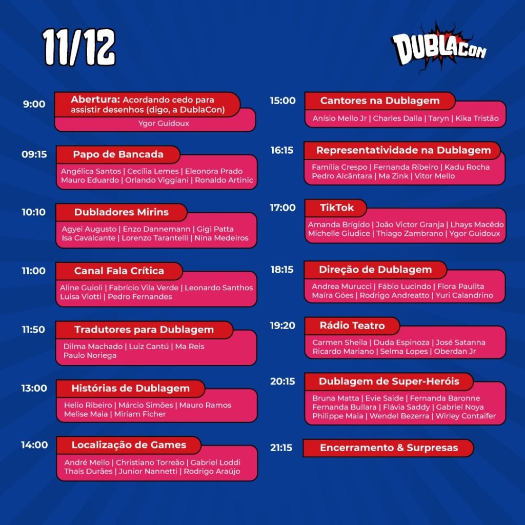 O evento começará as 9h, com a abertura e seguido de 13 painéis realizados durante todo o dia em que os profissionais da dublagem irão trocar seus conhecimentos e vivências nos estúdios de dublagem, terá exposição sobre a história da dublagem no país. Entre eles Histórias de Dublagem, Dublagem de Super-Heróis, Direção para Dublagem, Cantores na Dublagem, Dubladores Mirins, Localização de Games, Tradução para Dublagem, Representatividade, um painel exclusivo da empresa TikTok, um encerramento que promete emocionar a todos os fãs com homenagens aos grandes nomes da dublagem que nos deixaram e muito mais.