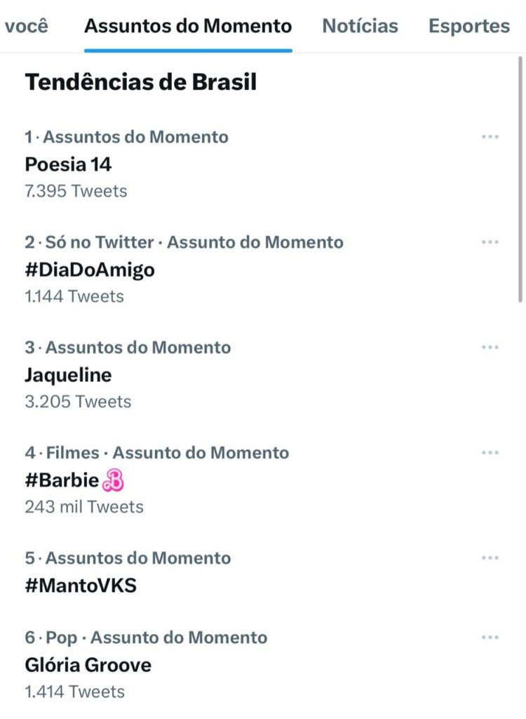 Já é um sucesso! O ‘Poesia Acústica 14’, lançado nesta quinta-feira (20), superou o filme da Barbie e se tornou o assunto mais comentado no Twitter Brasil durante a tarde de hoje. No YouTube, o clipe da edição, com artistas como Glória Groove, Derxan, Djonga e outros, alcançou 1 milhão de visualizações em apenas 4 horas após o lançamento.