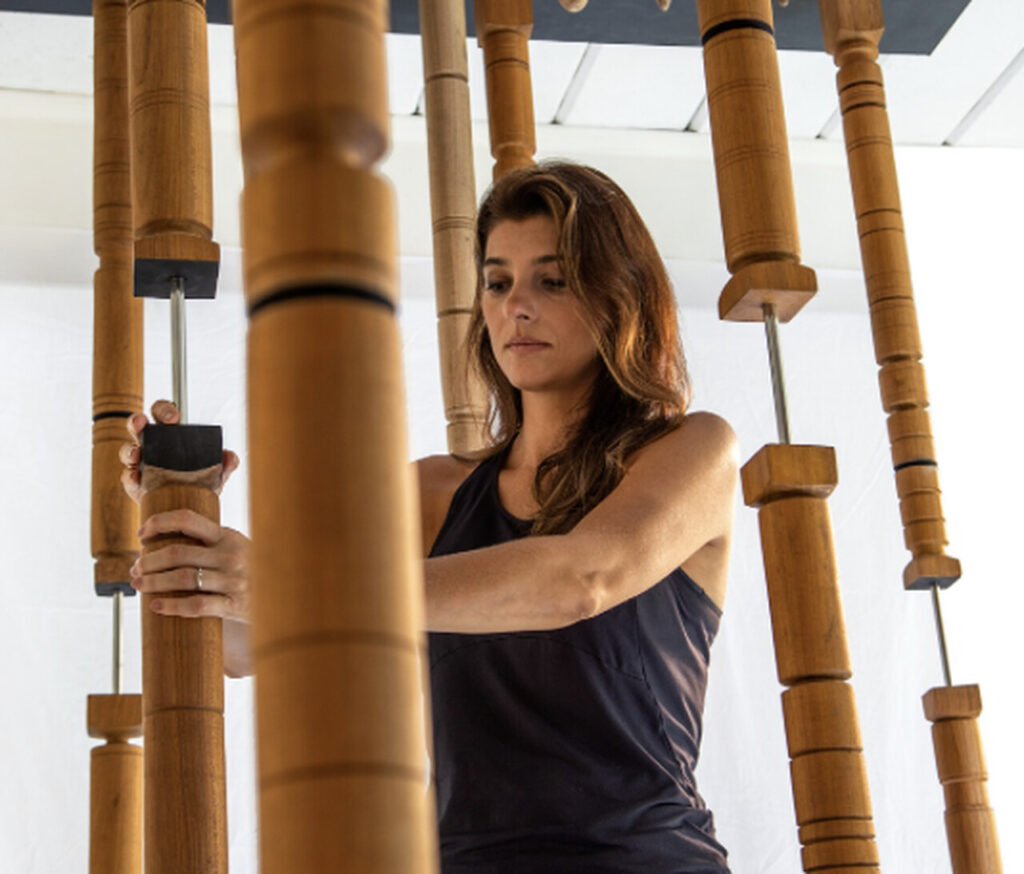 A artista gosta de trabalhar com a madeira em seu formato mais bruto e com objetos aleatórios que trazem versatilidade e fazem parte da natureza. Da matéria prima, até o trabalho final, os camaleões ganham forma durante o processo e fazem jus à sua resiliência característica. Os “camaleões” são esculturas de finas colunas de madeira torneada que tem diferentes formas e são arredondadas, planas e pintadas em algumas partes.
