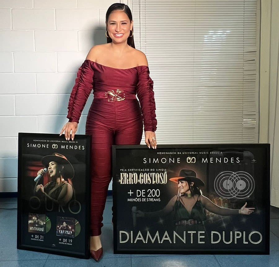 Simone Mendes foi premiada pelo sucesso de “Erro Gostoso”! A cantora ganhou da Universal Music Brasil sua primeira certificação de diamante duplo por ter ultrapassado 200 milhões de plays nas plataformas de streaming com o primeiro hit de sua carreira solo.